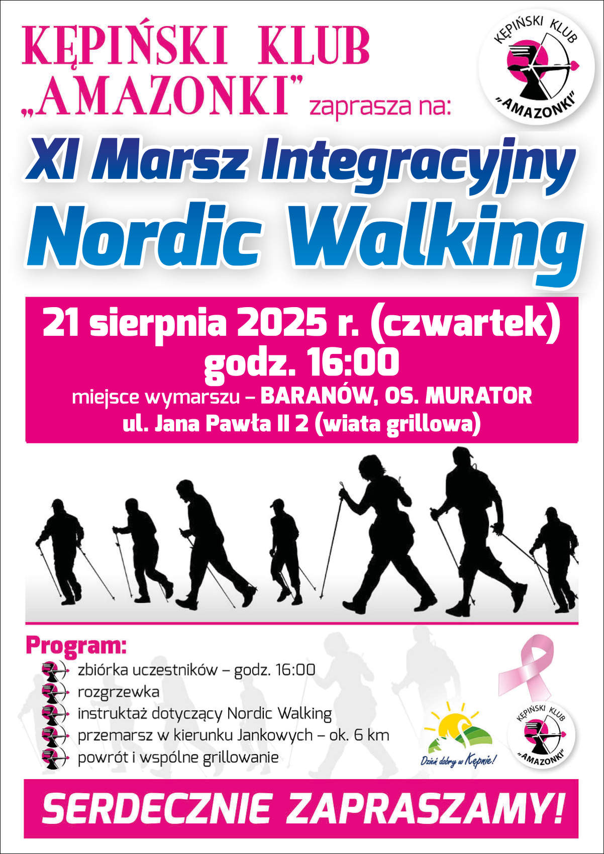 Marsz z kijkami ma zbawienny wpływ na kondycję psychofizyczną organizmu, w związku z tym Kępiński Klub „AMAZONKI” już po raz 11 pragnie zachęcić społeczność lokalną do uprawniania tej formy aktywności. Marsz prowadzony będzie przez doświadczonego fizjoterapeutę, wspieranego przez wolontariuszy z Kępińskiego Klubu Amazonek, którzy będą instruować osoby początkujące. Przewidujemy dwie trasy: 1 dla początkujących – 3 km oraz 2 dla zaawansowanych – 10 km . Marsz Nordic Walking cieszy się coraz większym powodzeniem i mamy nadzieję, że na stałe wpisze się w kalendarz Gminy Kępno